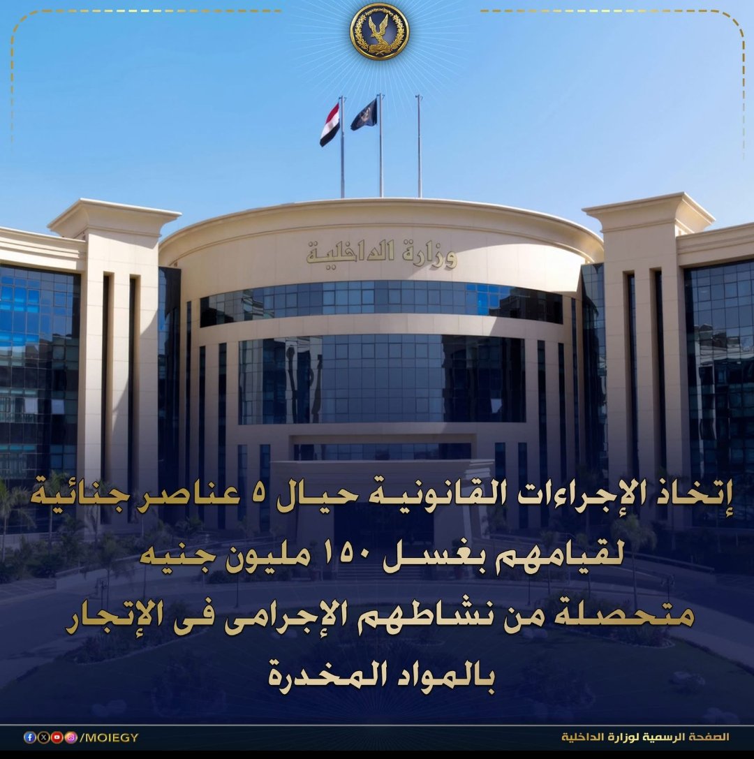 في إطار مواصلة جهود أجهزة وزارة الداخلية لمكافحة جرائم غسل الأموال وتتبع ثروات العناصر الإجرامية، ورصد ممتلكاتهم واتخاذ الإجراءات القانونية حيالهم، تمكن قطاع مكافحة المخدرات والأسلحة والذخائر غير المرخصة، بالتنسيق مع الأجهزة المعنية بالوزارة، من اتخاذ الإجراءات القانونية تجاه خمسة عناصر جنائية لقيامهم بغسل الأموال المتحصلة من نشاطهم الإجرامي في الاتجار بالمواد المخدرة وترويجها.