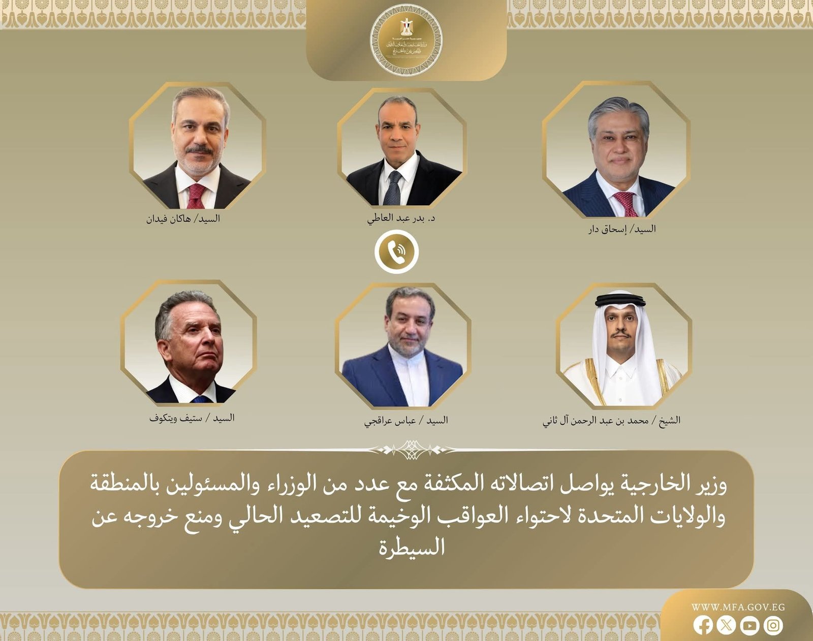 وشملت الاتصالات كلاً من إسحاق دار نائب رئيس الوزراء ووزير خارجية باكستان، وهاكان فيدان وزير خارجية تركيا، ومحمد بن عبد الرحمن آل ثاني رئيس الوزراء ووزير خارجية قطر، وعباس عراقجي وزير الخارجية الإيراني، إلى جانب ستيف ويتكوف المبعوث الأمريكي الخاص للشرق الأوسط، وذلك في إطار متابعة التطورات المتسارعة وبحث سبل خفض التصعيد ووقف الحرب.