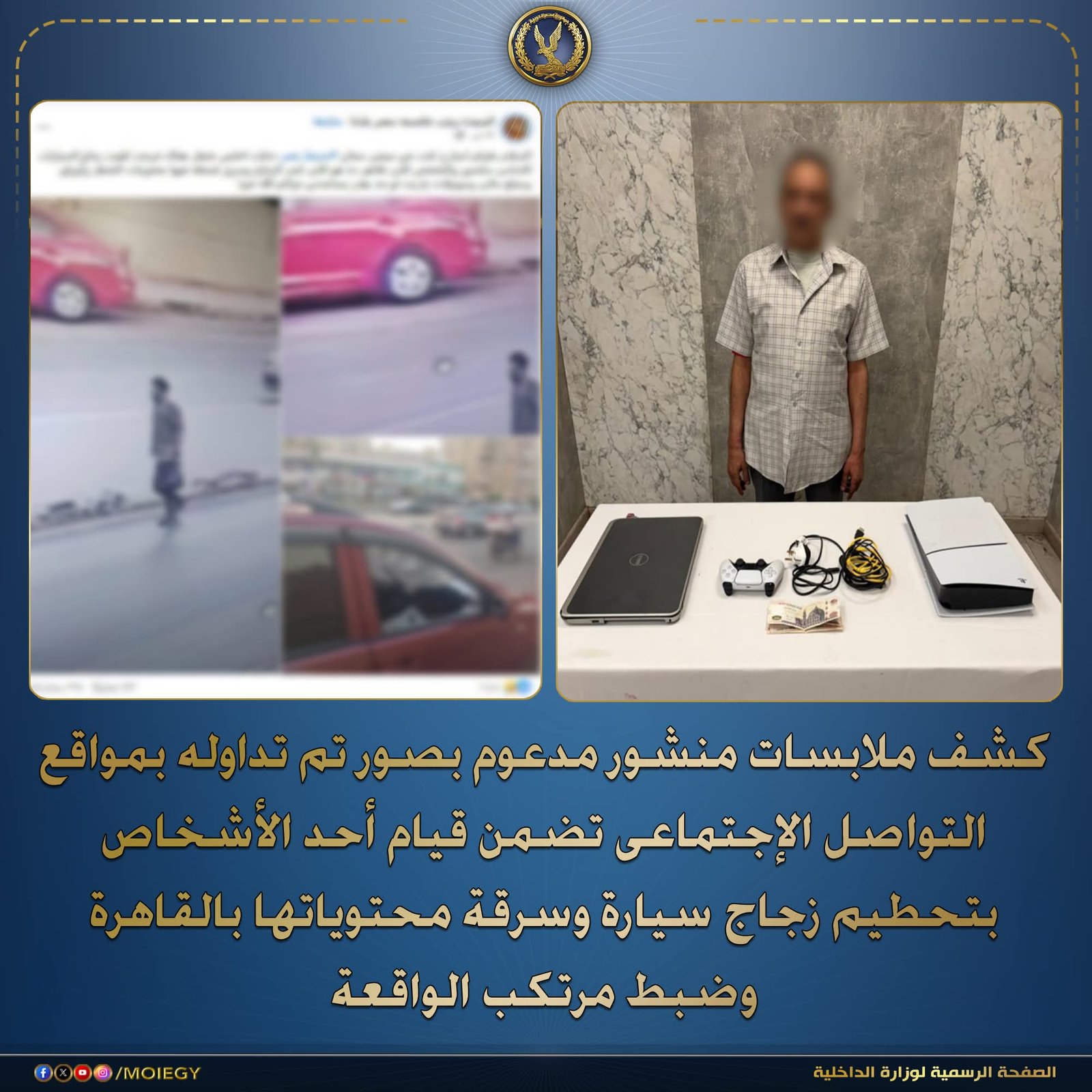 كشفت الأجهزة الأمنية بمديرية أمن القاهرة تحت قيادة اللواء محمد يوسف مدير أمن القاهرة، ملابسات منشور مدعوم بصور تم تداوله عبر مواقع التواصل الاجتماعي يشير إلى قيام أحد الأشخاص بتحطيم زجاج سيارة وسرقة محتوياتها.