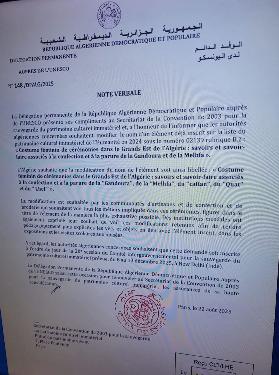 تحمل الوثيقة التاريخ 22 غشت 2025 طلباً لتعديل اسم عنصر “الزي النسائي الاحتفالي في شرق الجزائر الكبير: المعارف والمهارات المرتبطة بصناعة وتزيين القندورة والملاحفة”، ليشمل القندورة والملاحفة والقفطان والجلابة والقط واللحيف، في محاولة واضحة لإدراج القفطان المغربي ضمن التراث الجزائري.
