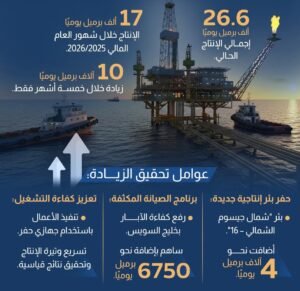 نجحت شركة بتروجلف التابعة لشركة جنوب الوادي المصرية القابضة للبترول، في رفع معدلات إنتاجها من حقولها بخليج السويس إلى نحو 26.6 ألف برميل يوميًا، مقارنة بنحو 17 ألف برميل يوميًا خلال شهور العام المالي الجاري 2025/2026، لتسجل بذلك أعلى معدل إنتاج منذ تأسيسها عام 1982.