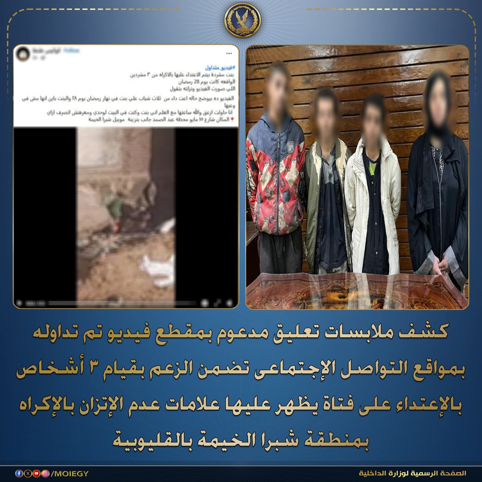 وبالفحص، بقيادة المقدم يوسف الشامي ومعاونيه، أمكن تحديد وضبط الأشخاص الظاهرين بمقطع الفيديو ( 3 عاطلين ” لإثنين منهم معلومات جنائية”، سيدة ” لها معلومات جنائية”)، جميعهم مقيمين بدائرة قسم شرطة ثان شبرا الخيمة بالقليوبية.