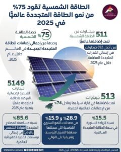 تصدرت الطاقة الشمسية الزيادة في القدرات الجديدة، بعدما استحوذت على 511 جيجاواط، أي ما يقرب من 75% من إجمالي الزيادة في قدرات الطاقة المتجددة ، وذلك وفقاً للتفاصيل المدونه بهذا الإنفوجرافيك.