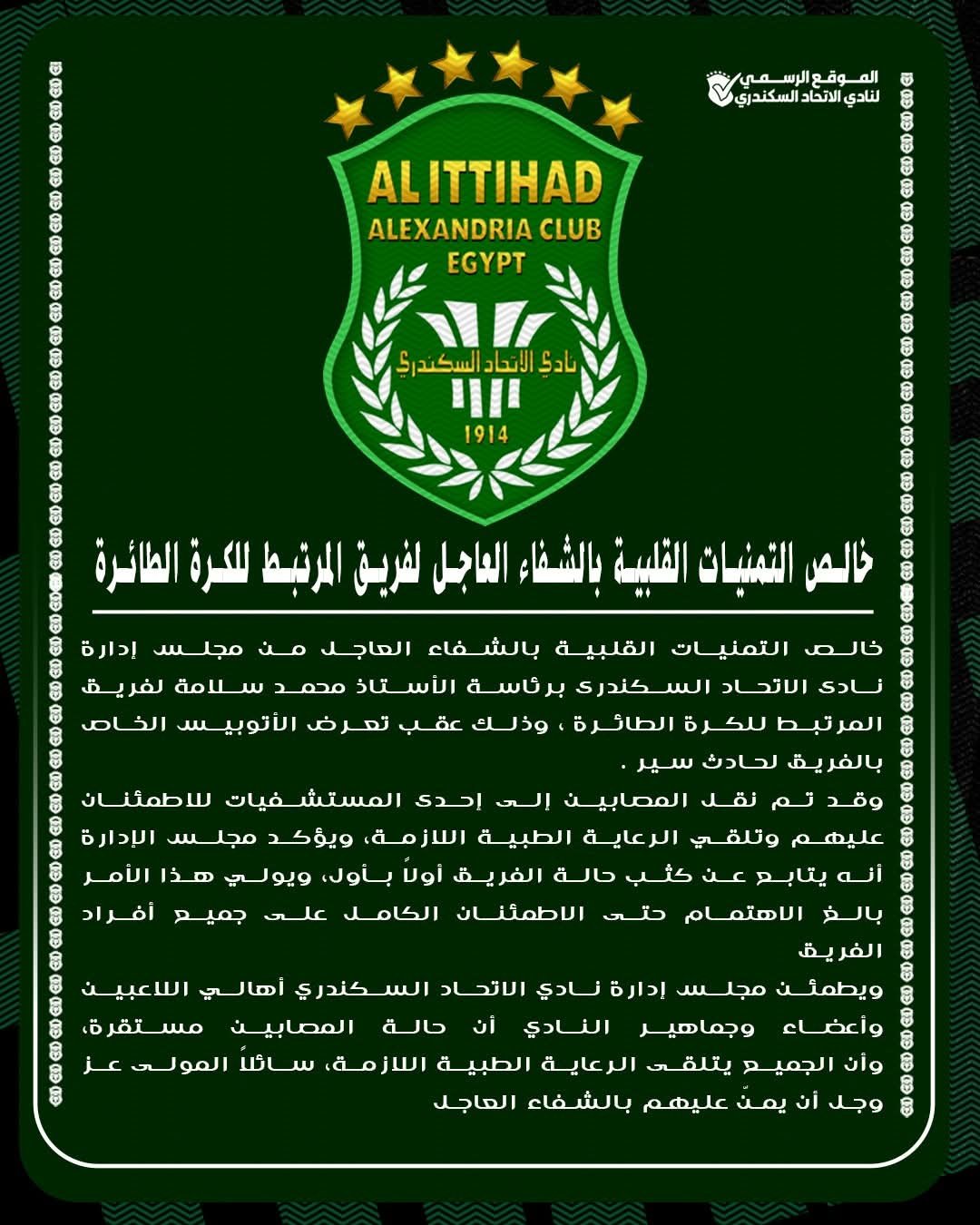 ومن جانبه قال الإتحاد المصري لكرة الطائرة،” نتمنى الشفاء العاجل للاعبي الإتحاد السكندري بعد تعرضهم لحادث سير”.