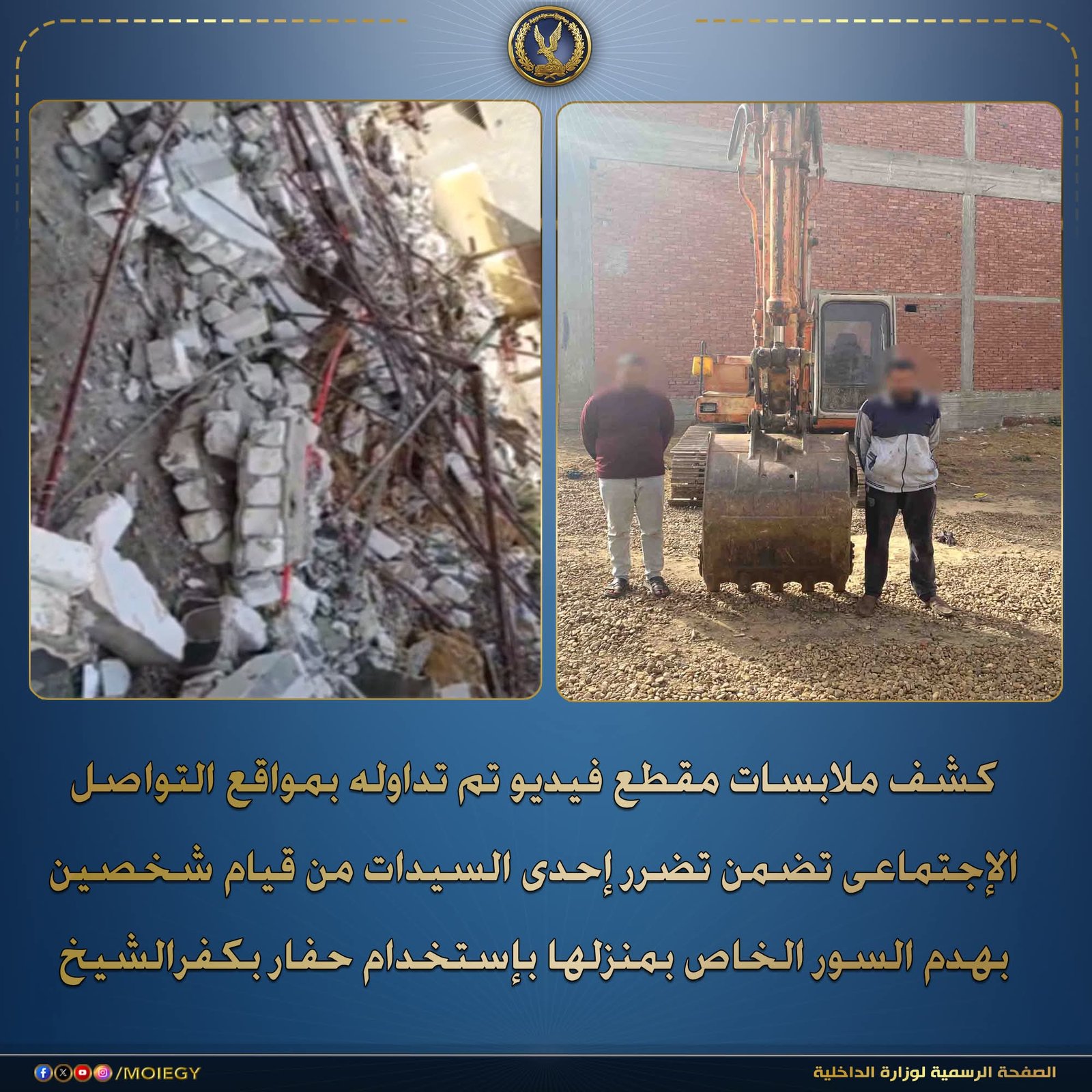 في إطار كشف ملابسات مقطع فيديو تم تداوله عبر مواقع التواصل الاجتماعي، تضمن تضرر إحدى السيدات من قيام شخصين بهدم السور الخاص بمنزلها باستخدام حفار بمحافظة كفر الشيخ، كثفت الأجهزة الأمنية جهودها للفحص والتحري.