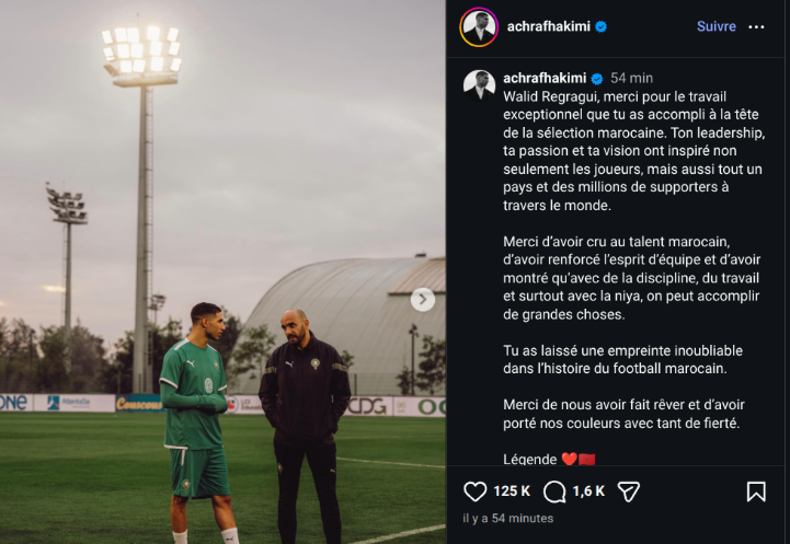 نشر حكيمي التدوينة عبر حسابه الرسمي على إنستغرام، مشيدًا بالعمل الاستثنائي الذي قدمه الركراكي خلال قيادته “أسود الأطلس”.
