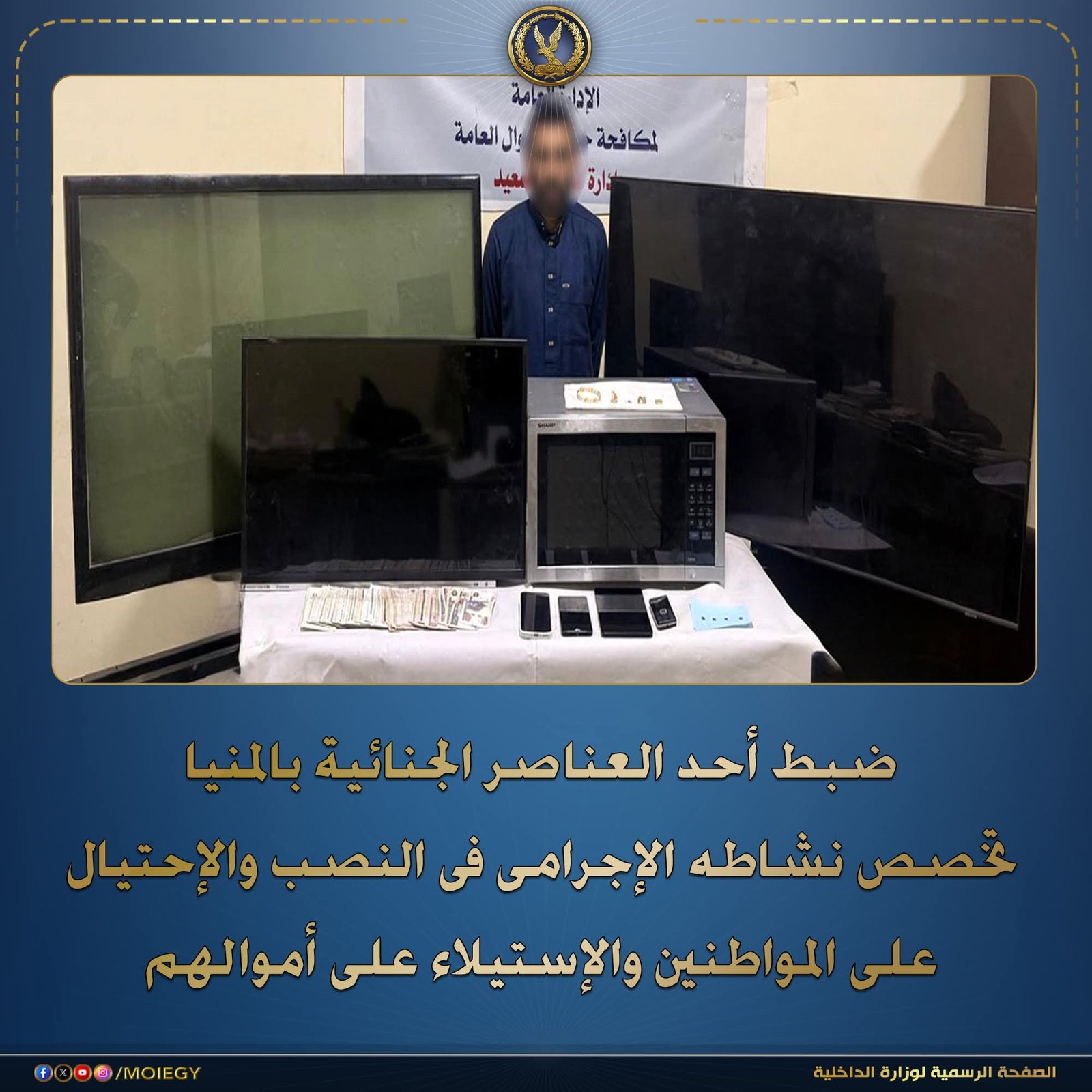 في إطار مواصلة وزارة الداخلية جهودها لمكافحة جرائم النصب والاحتيال الإلكتروني وحماية أموال المواطنين، كشفت معلومات وتحريات الإدارة العامة لمكافحة جرائم الأموال العامة بقطاع مكافحة جرائم الأموال العامة والجريمة المنظمة عن نشاط إجرامي لأحد العناصر الجنائية بمحافظة المنيا.