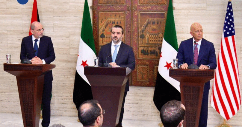 أعلن وزير الخارجية السوري أسعد الشيباني، خلال مؤتمر صحافي مشترك مع نظيره الأردني أيمن الصفدي والمبعوث الأميركي الخاص إلى سوريا توماس براك، إطلاق خارطة طريق مؤلفة من 6 خطوات لحل أزمة محافظة السويداء، بدعم من الأردن والولايات المتحدة.