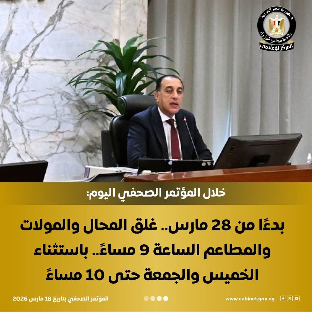 وأوضح أن مجلس الوزراء قرر إغلاق المحال والمولات والمطاعم والكافيهات في تمام الساعة 9 مساءً، على أن يكون الإغلاق في الساعة 10 مساءً يوم الجمعة، وذلك اعتبارًا من يوم السبت 28 مارس 2026، ولمدة شهر .