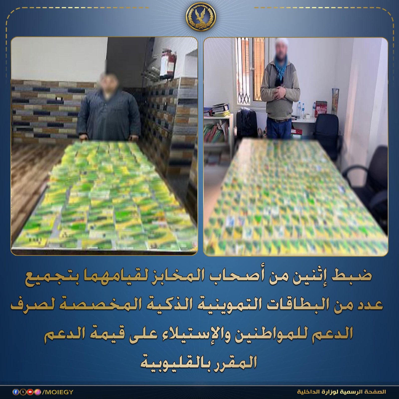 وأسفرت الجهود عن ضبط صاحبي مخبزين بلديين بدائرة المحافظة، وبحوزتهما 730 بطاقة تموينية ذكية خاصة بالمواطنين، قاما بتجميعها بصورة غير مشروعة بهدف الاستيلاء على قيمة الدعم المقرر لمالكيها.