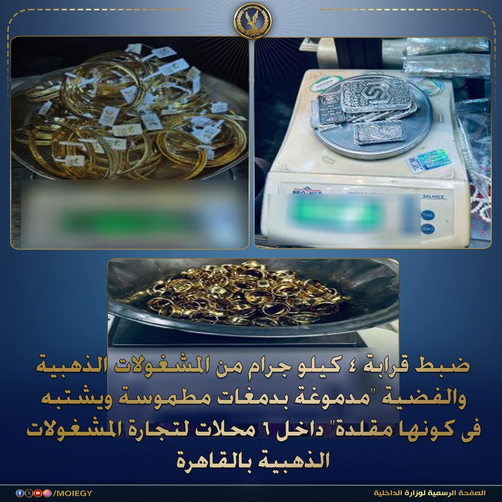 وأسفرت الجهود عن ضبط كمية من المشغولات الذهبية والفضية بلغ وزنها قرابة 4 كيلو جرامات، تحمل دمغات مطموسة ويُشتبه في كونها مقلدة، داخل 6 محال لتجارة المشغولات الذهبية بدائرة قسم شرطة الجمالية بالقاهرة.
