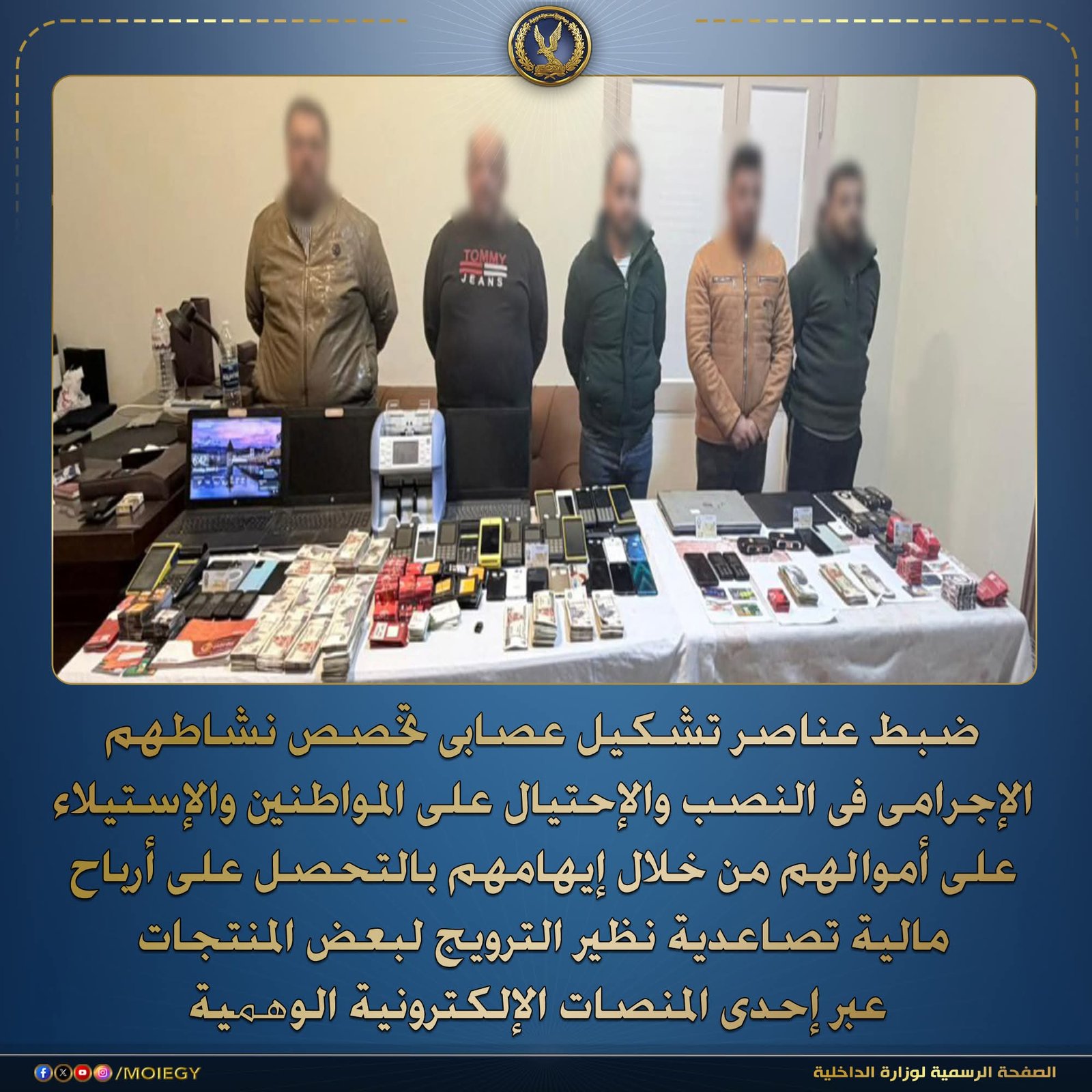 في إطار جهود وزارة الداخلية لمكافحة جرائم النصب والاحتيال على المواطنين والإستيلاء على أموالهم، نجحت الأجهزة الأمنية في كشف نشاط تشكيل إجرامي دولي تخصص في إدارة منصة إلكترونية وهمية للنصب على المواطنين.