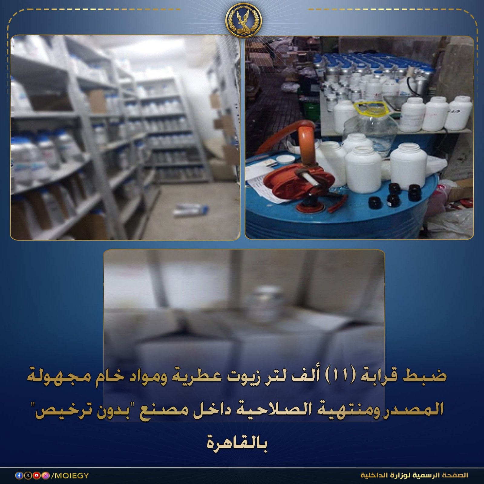 المصنع كان يحتوي على قرابة 11 ألف لتر من الزيوت العطرية والمواد الخام والمنتجات النهائية، مكتوب عليها بيانات مغشوشة ومقلدة لعلامات تجارية شهيرة، بالإضافة إلى مستلزمات الإنتاج و2500 قطعة ملصق و1250 عبوة بلاستيكية فارغة وخط إنتاج كامل والأدوات المستخدمة في التعبئة.