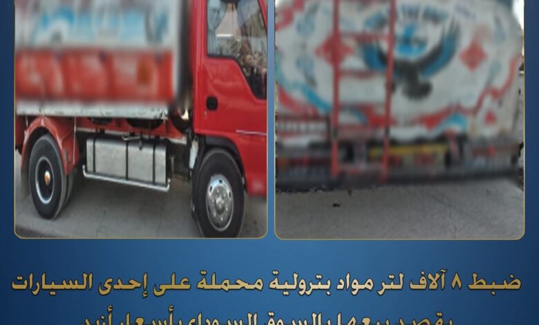 استمرارًا لجهود وزارة الداخلية في مكافحة جرائم الاستيلاء على الدعم والاتجار غير المشروع في المواد البترولية، تمكنت الإدارة العامة لشرطة التموين والتجارة الداخلية بقطاع الأمن الاقتصادي من ضبط سيارة محمّلة بـ 8 آلاف لتر من المواد البترولية (سولار)، بقصد بيعها في السوق السوداء بأسعار تزيد عن السعر الرسمي، وذلك بدائرة مركز شرطة أبنوب بمحافظة أسيوط.
