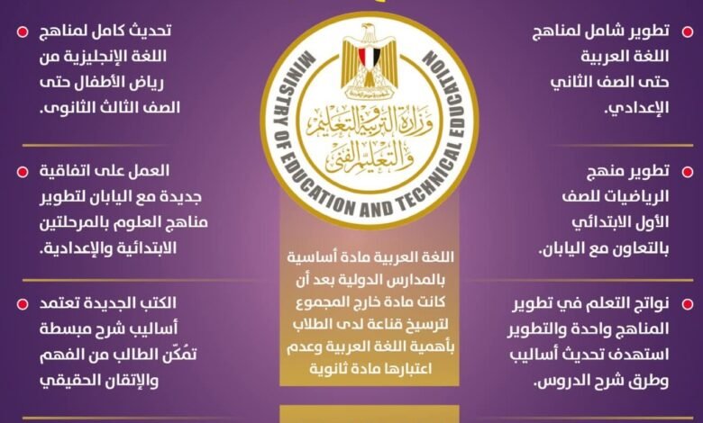 كما يجري تطوير شامل لمناهج اللغة العربية حتى الصف الثاني الإعدادي، في إطار رؤية تستهدف إعادة الاعتبار لمكانة اللغة العربية وترسيخ أهميتها كلغة هوية وثقافة وعلم، خاصة بعد أن كانت في بعض المدارس الدولية مادة خارج المجموع، ما أدى إلى تراجع اهتمام الطلاب بها.