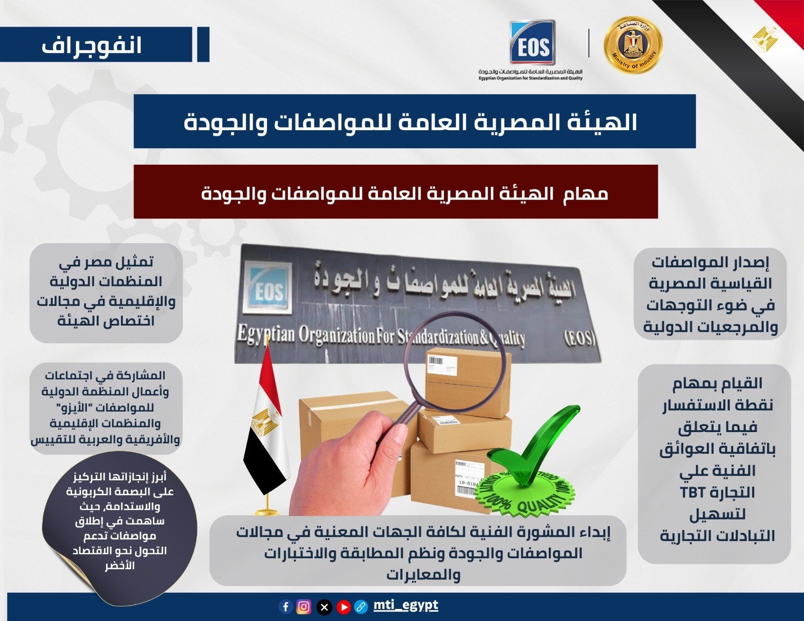 تقوم الهيئة المصرية العامة للمواصفات والجودة التابعة لوزارة الصناعة بدورٍ محوري في إصدار المواصفات الوطنية وفقًا للمواصفات القياسية الدولية، مما يعزز تنافسية المنتجات المصرية عالميًا، ومن أبرز إنجازاتها التركيز على البصمة الكربونية والاستدامة، حيث ساهمت في إطلاق مواصفات تدعم التحول نحو الإقتصاد الأخضر.