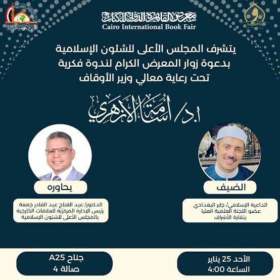 في إطار الفعاليات الثقافية والفكرية المصاحبة لمعرض الكتاب، عُقدت اليوم ندوة فكرية وثقافية بجناح المجلس الأعلى للشئون الإسلامية، بحضور الداعية الإسلامي الشيخ جابر البغدادي، عضو اللجنة العلمية العليا بنقابة الأشراف، وذلك في حوار مفتوح أدارَه الدكتور عبد الفتاح عبد القادر جمعة، رئيس الإدارة المركزية للعلاقات الخارجية بالمجلس الأعلى للشئون الإسلامية.