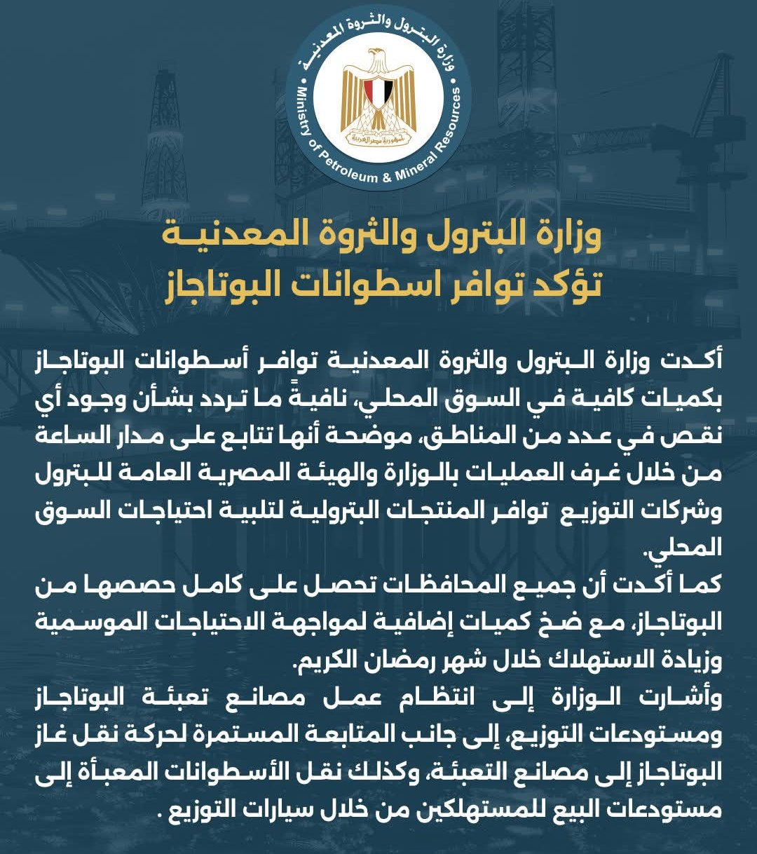 كما أكدت أن جميع المحافظات تحصل على كامل حصصها من البوتاجاز، مع ضخ كميات إضافية لمواجهة الاحتياجات الموسمية وزيادة الاستهلاك خلال شهر رمضان الكريم.
