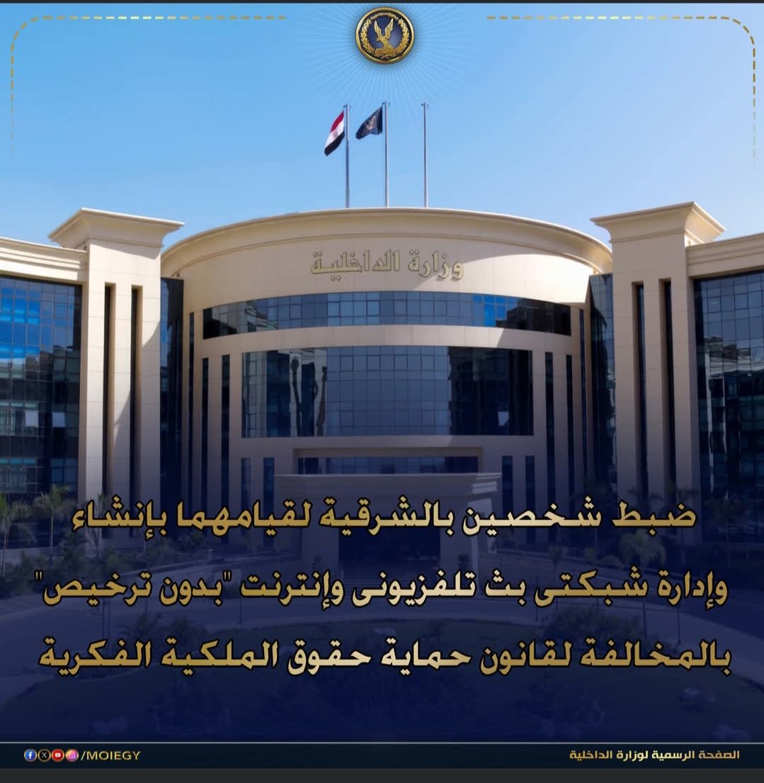 وفقاً لتوجيهات وزارة الداخلية و إستمراراً لمكافحة جرائم التعدى على حقوق الملكية الفكرية..و بناءً على إجراء جميع التحريات من الإدارة العامة لمباحث المصنفات وحماية حقوق الملكية الفكرية بقطاع الشرطة المتخصصة تم ضبط (شخصين) قاموا بإنشاء وإدارة شبكتى بث تلفزيونى وإنترنت ، والتى تقوم بإستقبال العديد من القنوات الفضائية المشفرة وغير المشفرة وإعادة بثها بشفرة خاصة بهما لاسلكياً بدون تصريح من الجهات المختصة بالمخالفة للقانون، وكذا إدارة محل لبيع مستلزمات فك شفرة القنوات الفضائية بنطاق دوائر مراكز شرطة (ديرب نجم – كفر صقر – القنايات) بمحافظة الشرقية.