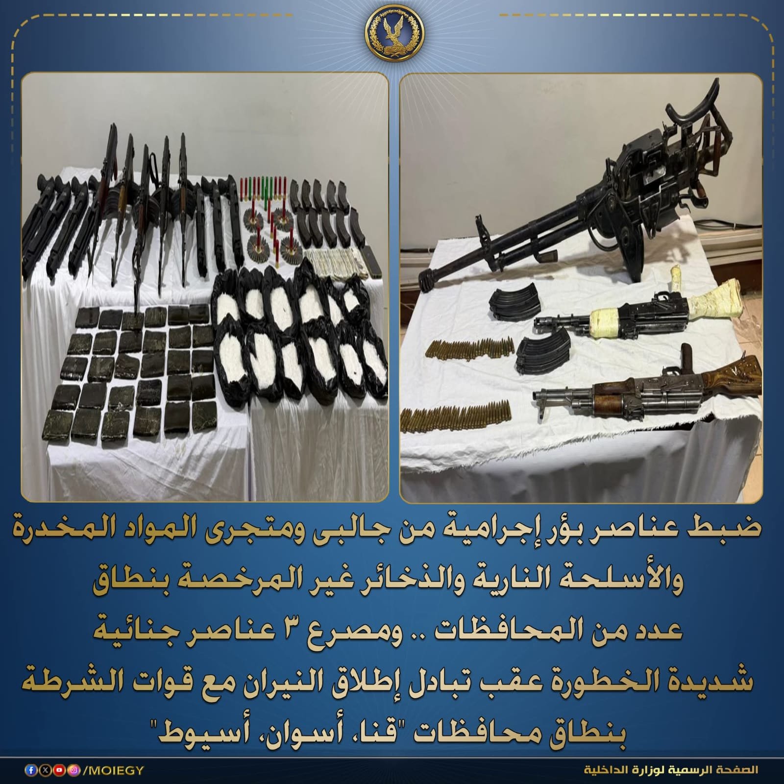 في إطار ماتبذلة وزارة الداخلية من جهود في توجيه الضربات الإستباقية للبؤر الإجرامية ومتجري المواد المخدرة والأسلحة النارية والذخائر غير المرخصة ، أكدت أنه تم عمل تحريات عن قطاعى (الأمن العام – مكافحة المخدرات والأسلحة والذخائر غير المرخصة) بالتنسيق مع أجهزة الوزارة المعنية قيام بؤر إجرامية بنطاق عدد من المحافظات تضم (عناصر جنائية شديدة الخطورة) بجلب كميات من المواد المخدرة والأسلحة النارية غير المرخصة تمهيداً للإتجار بها .