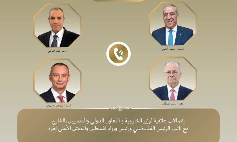 أجرى الدكتور بدر عبد العاطي، وزير الخارجية والتعاون الدولي والمصريين بالخارج، اتصالات هاتفية مع كل من حسين الشيخ نائب الرئيس الفلسطيني، والدكتور محمد مصطفى رئيس الوزراء الفلسطيني، ونيكولاي ملادينوف الممثل الأعلى لغزة، لبحث مستجدات الأوضاع في الأراضي الفلسطينية المحتلة، خاصة في قطاع غزة والضفة الغربية.