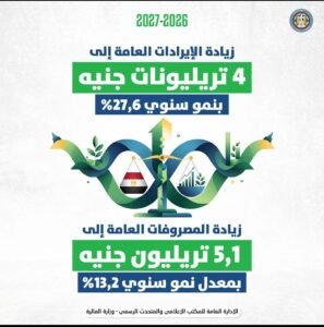 ٤ تريليونات جنيه الإيرادات العامة بزيادة ٢٧,٦٪ والمصروفات ٥,١ تريليون جنيه بمعدل نمو ١٣,٢٪