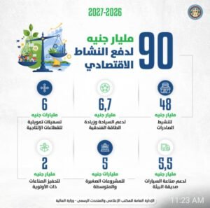 ٩٠ مليار جنيه لبرامج مساندة النشاط الاقتصادي وتحفيز الإنتاج والتصنيع وريادة الأعمال وزيادة الصادرات الخدمية والسلعية
