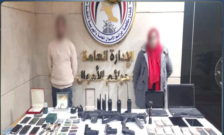 وبتفتيشهما، عُثر بحوزتهما على عدد من الكارنيهات المزورة، وبطاقات دفع إلكتروني، ودفاتر شيكات، إلى جانب مسدسات ورشاشات وأجهزة لاسلكية “ألعاب أطفال”، وجهاز صاعق كهربائي، ومشغولات ذهبية، وأجهزة إلكترونية، فضلاً عن 8 هواتف محمولة، وبفحصها تبين احتواؤها على دلائل تؤكد نشاطهما الإجرامي.
