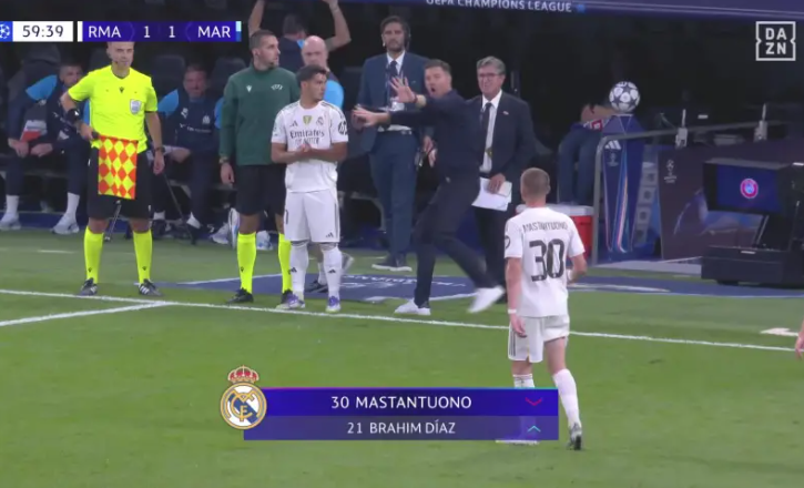 في المباراة الأولى لريال مدريد في دوري أبطال أوروبا موسم 2025/26 أمام أولمبيك مارسيليا على ملعب سانتياغو برنابيو، شهدت الدقيقة 59 لحظة غير متوقعة. كان من المقرر إدخال براهيم دياز بديلاً عن فرانكو ماستانتوونو، لكن المدرب خافي ألونسو أوقف التغيير فجأة، مما أذهل الدولي المغربي الذي عاد للجلوس على الدكة ثم استأنف تسخينه. استشار ألونسو طاقمه الفني ليقرر إدخال لاعبين بدلاً من واحد، حيث دخل براهيم دياز وفينيسيوس جونيور معًا، ربما لتجنب إثارة غضب النجم البرازيلي. هذا التصرف يبرز حاجة دياز لتعزيز ثقته بنفسه وإظهار شخصيته داخل الملعب، بدل التواضع الزائد الذي قد يُفسر كضعف.