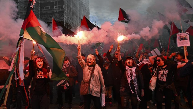قبل المباراة، تظاهر مئات المؤيدين لفلسطين خارج الملعب برفع الأعلام ولافتات تندد بالعمليات في غزة، وسط إجراءات أمنية مشددة. داخل الملعب، أثناء النشيد الإسرائيلي، علت صافرات الاستهجان وبطاقات حمراء، مع لافتة كتب عليها: “دعوا الأطفال يعيشون”. خفضت السلطات عدد المتفرجين إلى 3000، مع تفتيش دقيق وإغلاق مداخل.